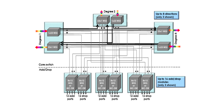 圖7. 基于1×N端口WSS + N×M端口WSS或者1×N端口WSS+N×M端口MCS的CDC ROADM節(jié)點(diǎn)