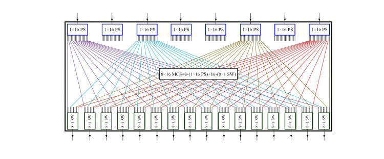 圖8. 8×16端口MCS光開關(guān)結(jié)構(gòu)(PS:光分路器,SW:光開關(guān))
