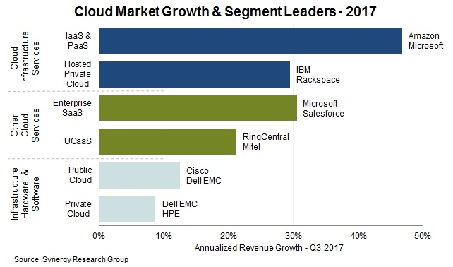 2017年市場(chǎng)領(lǐng)導(dǎo)者中最突出的企業(yè)包括Amazon/AWS、微軟、IBM、Salesforce、戴爾EMC、HPE和思科。