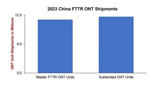 首先,據(jù)Dell'Oro了解,2023年,共有2300多萬臺FTTR ONT運(yùn)往中國運(yùn)營商。在這2300多萬臺ONT中,主ONT單元和子單元之間幾乎是1:1的關(guān)系。實際上,主單元和子單元之間的比例約為1:1.01。這意味著平均部署包括一個主單元和一個附屬單元,考慮到中國的住宅通常較小,這是有道理的。