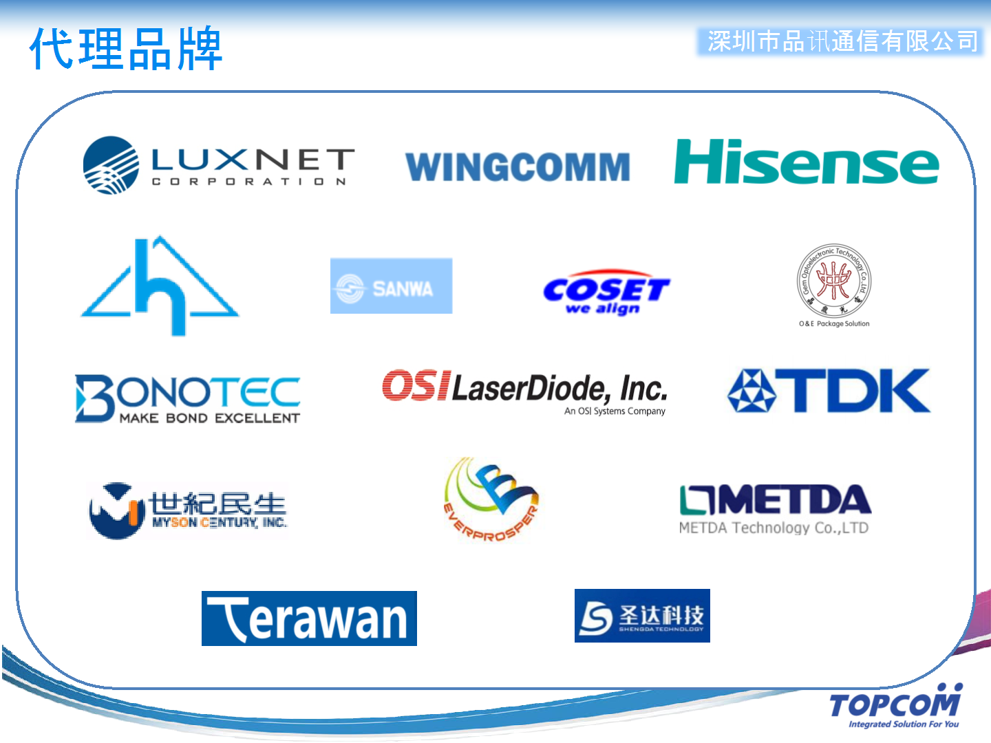 品訊通信成立于2011年,是一家以高科技產(chǎn)品代理銷售、市場(chǎng)推廣、售前售后技術(shù)服務(wù)為一體的企業(yè),公司產(chǎn)品服務(wù)于光通訊有源光模塊、無源和光器件廠商、OTDR儀表以及數(shù)據(jù)存儲(chǔ)、云計(jì)算廠商,可提供Chip、TO、TOSA/ROSA、IC、MT插芯和MPO散件、100G誤碼測(cè)試儀、OTDR用激光器和探測(cè)器、粘合膠水、COB自動(dòng)耦合平臺(tái)及TO管帽及陶瓷基板等產(chǎn)品。是的了,品訊通信就是一家典型的“代理商”。