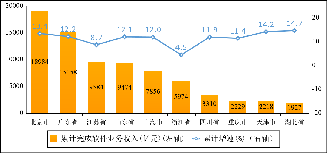 主要軟件大省業(yè)務(wù)收入占比保持穩(wěn)定。前8個月,北京、廣東、江蘇、山東、上海軟件業(yè)務(wù)收入居全國前5,同比分別增長13.4%、12.2%、8.7%、12.1%和12%,5?。ㄊ校┖嫌嬡浖I(yè)務(wù)收入61057億元,占全國比重為71.4%,占比與前7個月持平。