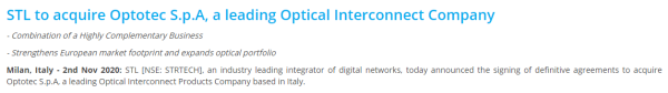 ICC訊(編譯:Nina)意大利米蘭,2020年11月2日--STL(Sterlite Technologies Ltd)(紐交所:STLTECH)表示已同意以2900萬歐元(3372萬美元)收購意大利光學互連產(chǎn)品提供商Optotec SpA。STL沒有透露交易預定何時完成,但表示這取決于慣常的監(jiān)管批準。