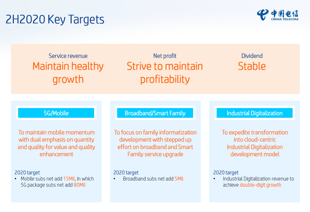 對(duì)于下半年的發(fā)展目標(biāo),中國電信指出,移動(dòng)業(yè)務(wù)方面繼續(xù)保持增長勢頭,并強(qiáng)調(diào)數(shù)量和質(zhì)量并重,實(shí)現(xiàn)價(jià)值提升。目標(biāo)2020年實(shí)現(xiàn)移動(dòng)用戶數(shù)凈增1500萬戶,5G套餐用戶數(shù)凈增8000萬戶。