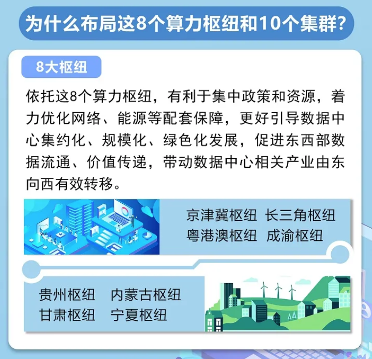 ICC訊 日前,國(guó)家發(fā)改委、中央網(wǎng)信辦、工信部和國(guó)家能源局聯(lián)合印發(fā)通知,同意在京津冀、長(zhǎng)三角、粵港澳大灣區(qū)、成渝、內(nèi)蒙古、貴州、甘肅、寧夏等8地啟動(dòng)建設(shè)國(guó)家算力樞紐節(jié)點(diǎn),并規(guī)劃了10個(gè)國(guó)家數(shù)據(jù)中心集群。至此,全國(guó)一體化大數(shù)據(jù)中心體系完成總體布局設(shè)計(jì),“東數(shù)西算”工程正式全面啟動(dòng)。