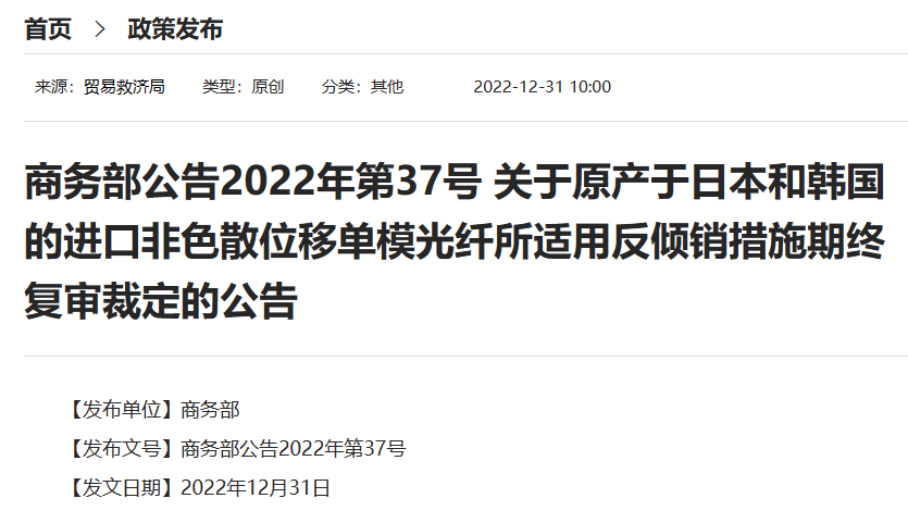 根據(jù)《中華人民共和國反傾銷條例》第五十條的規(guī)定,商務(wù)部根據(jù)調(diào)查結(jié)果向國務(wù)院關(guān)稅稅則委員會提出繼續(xù)實(shí)施反傾銷措施的建議,國務(wù)院關(guān)稅稅則委員會根據(jù)商務(wù)部的建議作出決定,自2023年1月1日起,對原產(chǎn)于日本和韓國的進(jìn)口非色散位移單模光纖繼續(xù)征收反傾銷稅,實(shí)施期限為5年。