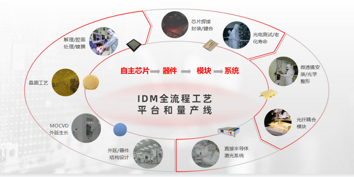 長光華芯2012年成立于蘇州,采用IDM模式,突破外延生長、芯片制造、封測各環(huán)節(jié)關鍵技術及工藝,擁有半導體激光行業(yè)中最大的6吋生產(chǎn)線。構(gòu)建了砷化鎵(GaAs)、磷化銦(InP)和氮化鎵(GaN)三大材料體系,具備邊發(fā)射和面發(fā)射兩大芯片結(jié)構(gòu)技術和工藝生產(chǎn)平臺。