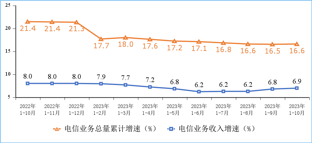 電信業(yè)務量收均實現(xiàn)小幅提升。1-10月份,電信業(yè)務收入累計完成14168億元,同比增長6.9%,增速較前三季度提升0.1個百分點。按照上年不變價計算的電信業(yè)務總量同比增長16.6%。