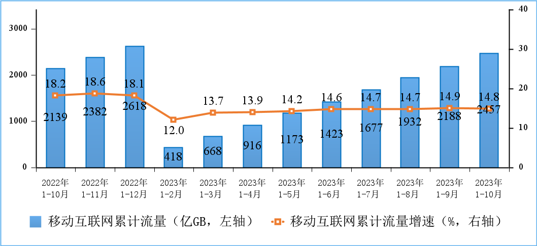 移動互聯(lián)網(wǎng)流量保持較快增長,10月DOU值創(chuàng)新高。1-10月份,移動互聯(lián)網(wǎng)累計流量達2456億GB,同比增長14.8%。截至10月末,移動互聯(lián)網(wǎng)用戶數(shù)達15.12億戶,比上年末凈增5853萬戶。10月當月戶均移動互聯(lián)網(wǎng)接入流量(DOU)達到17.81GB/戶·月,同比增長10.5%,較上年12月份高1.63GB/戶·月。
