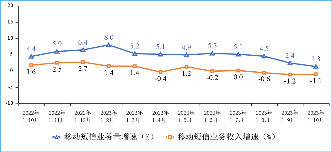 移動語音和短信業(yè)務持續(xù)收縮。1-10月份,移動電話去話通話時長完成1.87萬億分鐘,同比下降1.9%;固定電話主叫通話時長完成664.7億分鐘,同比下降4.5%。1-10月份,全國移動短信業(yè)務量同比增長1.3%,增速較前三季度回落1.1個百分點;移動短信業(yè)務收入同比下降1.1%,降幅較前三季度收窄0.1個百分點。