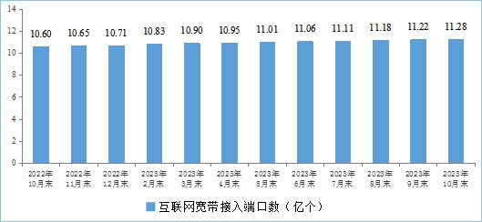 千兆光纖寬帶網(wǎng)絡建設持續(xù)推進。截至10月末,全國互聯(lián)網(wǎng)寬帶接入端口數(shù)量達11.28億個,比上年末凈增5675萬個。其中,光纖接入(FTTH/O)端口達到10.86億個,比上年末凈增6097萬個,占互聯(lián)網(wǎng)寬帶接入端口的96.3%。截至10月末,具備千兆網(wǎng)絡服務能力的10G PON端口數(shù)達2216萬個,比上年末凈增693萬個。