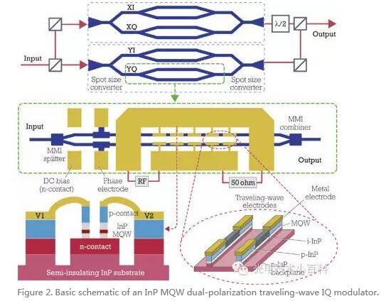 圖二演示了雙極行波IQ調(diào)制器的基本概念。最近已有商業(yè)化的低電壓高帶寬InP IQ調(diào)制器面市。這些調(diào)制器不但尺寸小而且適合與其他InP器件比如激光器以及高速光接收器集成起來。這些優(yōu)點正是更小更快的下一代相關(guān)光模塊需要的。