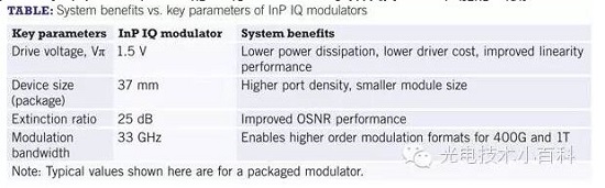 盡管對于100G系統(tǒng)來說DP-QPSK調(diào)制是各個系統(tǒng)供應(yīng)商都通用的模式,但是400G系統(tǒng)仍然存在很多不同的調(diào)制方式,也引起了很多的爭議。不管怎樣,這些系統(tǒng)都需要高帶寬高線性高效率的調(diào)制器。下表也列出了新型的InP行波MZ調(diào)制器參數(shù)以及對系統(tǒng)性能的貢獻。