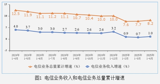 ICC訊 工業(yè)和信息化部最新數(shù)據(jù)顯示,2025年前4個月我國通信行業(yè)保持穩(wěn)健發(fā)展態(tài)勢。電信業(yè)務(wù)收入累計完成5985億元,同比增長1%;電信業(yè)務(wù)總量同比增長8.2%,增速較一季度回升0.5個百分點。