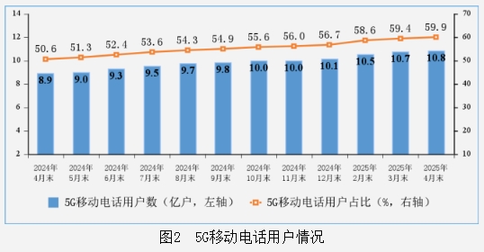 在用戶發(fā)展方面,固定寬帶接入用戶穩(wěn)步增長。截至4月末,全國固定互聯(lián)網(wǎng)寬帶接入用戶達6.8億戶,其中千兆及以上用戶達2.2億戶,占比提升至32.4%。移動電話用戶總數(shù)達18.03億戶,5G用戶規(guī)模突破10.81億戶,占比達59.9%,顯示出5G網(wǎng)絡(luò)應(yīng)用的快速普及。