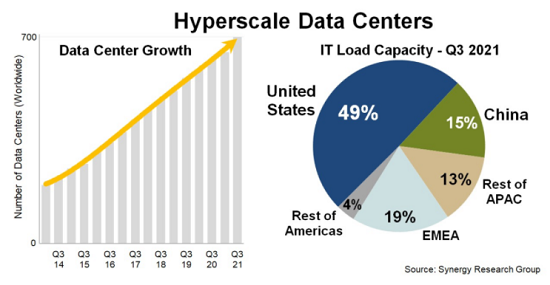 ICC訊(編譯:Nina)Synergy Research Group的新數(shù)據(jù)顯示,截至2021年第三季度末,全球超大規(guī)模提提供商(Hyperscale Providers)運(yùn)營(yíng)的大型數(shù)據(jù)中心數(shù)量增加到700個(gè)。以關(guān)鍵IT負(fù)載來(lái)衡量,美國(guó)占這些數(shù)據(jù)中心容量的49%。雖然美國(guó)在全球容量中的份額一直在下降,但近年的下降速度很慢,每年僅下降一個(gè)百分點(diǎn)。在美國(guó)之后,中國(guó)是超大規(guī)模數(shù)據(jù)中心容量的第二大貢獻(xiàn)國(guó),占總?cè)萘康?5%。剩余容量分布在亞太其他地區(qū)(13%)、EMEA(歐洲、中東和非洲地區(qū))(19%),以及加拿大/拉美地區(qū)(4%)。