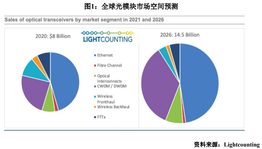 根據(jù)Lightcounting預(yù)測,受益于在高數(shù)據(jù)速率模塊應(yīng)用拓展、大型云服務(wù)商資本支出的持續(xù)增長以及國家電信運營商推動,光模塊市場規(guī)模將從2020年的80億美元增加到2026年的145億美元,年復(fù)合增長率為10.42% 。
