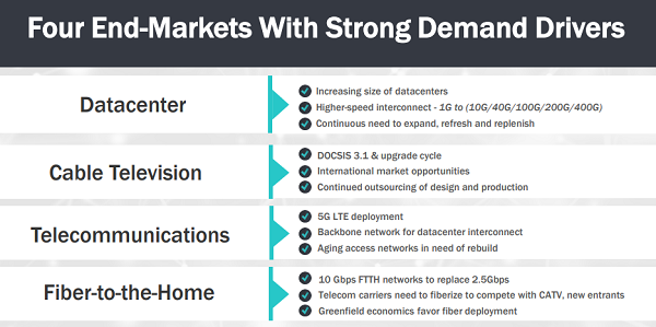 分產(chǎn)品來看,數(shù)據(jù)中心產(chǎn)品銷售收入2594萬美元(同比下滑22%,環(huán)比下滑20%),CATV產(chǎn)品銷售收入1864萬美元(同比增長341%,環(huán)比增長17%),電信產(chǎn)品銷售收入448萬美元(同比增長75%,環(huán)比增長28%),F(xiàn)TTH產(chǎn)品銷售收入42萬美元。