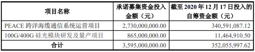 公告顯示,本次非公開發(fā)行股票募集資金的投資項(xiàng)目及募集資金使用計(jì)劃用于PEACE跨洋海纜通信系統(tǒng)運(yùn)營項(xiàng)目、100G/400G硅光模塊研發(fā)及量產(chǎn)項(xiàng)目以及補(bǔ)充流動資金。亨通光電為順利推進(jìn)募集資金投資項(xiàng)目,在本次募集資金到賬前,已以自籌資金3.52億元預(yù)先投入募集資金投資項(xiàng)目。