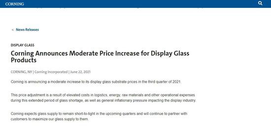 據(jù)中國電子報,康寧顯示集團總裁張錚表示:“康寧一直在利用制程優(yōu)化盡量克服成本,現(xiàn)在已經(jīng)沒有辦法完全抵消成本的增加。”