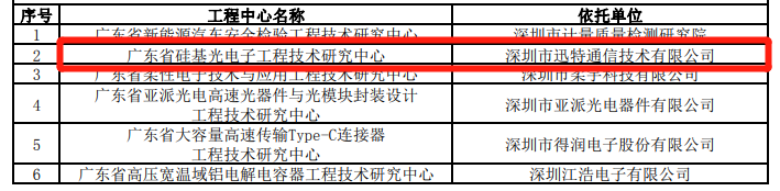 ICCSZ訊 3月4日,廣東省科學(xué)技術(shù)廳公布“2019年度廣東省工程技術(shù)研究中心”認(rèn)定名單。憑借過硬實(shí)力,迅特通信申報(bào)的“廣東省硅基光電子工程技術(shù)研究中心”成功獲得認(rèn)定。