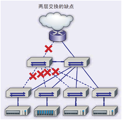 盡管以太網(wǎng)效率很高,但隨著網(wǎng)絡(luò)規(guī)模的增大,它也存在一些缺點(diǎn)。在一個由多個以太網(wǎng)交換機(jī)組成的網(wǎng)絡(luò)中,為了阻止地址解析協(xié)議(ARP)請求等廣播包在網(wǎng)絡(luò)中泛濫和循環(huán),使用了一種稱為生成樹協(xié)議(STP)的技術(shù)。STP阻塞冗余鏈接以防止網(wǎng)絡(luò)中發(fā)生循環(huán)。在STP技術(shù)上運(yùn)行的網(wǎng)絡(luò)在主鏈路失敗時使用冗余鏈路作為故障轉(zhuǎn)移。這為基礎(chǔ)結(jié)構(gòu)提供了彈性,代價是可用帶寬的利用率僅為一半。