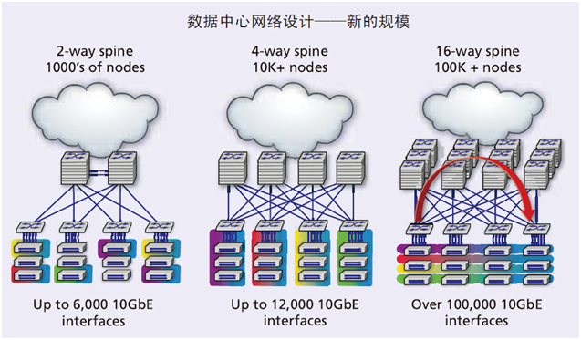 在一個脊葉網(wǎng)絡(luò)結(jié)構(gòu)中,葉交換機(jī)控制服務(wù)器之間的流量,而脊交換機(jī)沿著葉交換機(jī)之間的最佳路徑轉(zhuǎn)發(fā)流量。一個被稱為16路脊的架構(gòu)可以擴(kuò)展到支持超過100,000個10千兆位以太網(wǎng)主機(jī)。