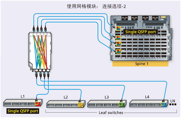 在這個設(shè)置中,一個網(wǎng)格模塊連接到一側(cè)的脊交換機(jī)和另一側(cè)的葉交換機(jī)。脊交換機(jī)側(cè)端口連接到脊交換機(jī)上的單板卡。每當(dāng)用戶連接葉交換機(jī)一側(cè)的葉端子交換機(jī)時,該端口就會自動斷開,并在網(wǎng)格模塊上的脊交換機(jī)端口之間來回移動——這些端口已經(jīng)連接到單獨(dú)的板卡上。不需要LC—LC跳線修補(bǔ)。