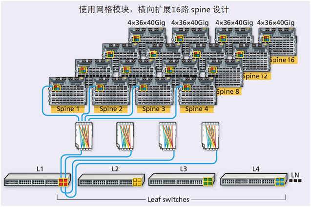 通過網(wǎng)格模塊擴(kuò)展網(wǎng)絡(luò)——從雙路脊交換機(jī)到4路脊交換機(jī)是容易的。我們只需要在每個脊交換機(jī)上使用一個網(wǎng)絡(luò)模塊,并將每個從葉交換機(jī)而來的40G上行鏈路分配到每個脊交換機(jī)的4個板卡上。