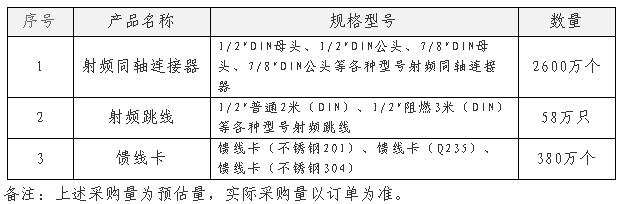 此外,中國電信還啟動(dòng)了2014年饋線配件產(chǎn)品集采,該招標(biāo)項(xiàng)目采購內(nèi)容為中國電信集團(tuán)公司和中國電信股份有限公司及其下屬的子公司、分公司到2016年12月所需的饋線配件產(chǎn)品,本次招標(biāo)范圍:射頻同軸連接器2600萬個(gè)、射頻跳線58萬只、饋線卡380萬個(gè)。具體規(guī)格、數(shù)量如下圖: