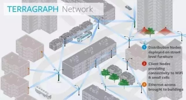 Terragraph屬于網(wǎng)絡(luò)回傳設(shè)備。它采用60GHz毫米波,將設(shè)備掛在城市的路燈桿上,組成網(wǎng)狀的回傳網(wǎng)絡(luò),節(jié)點間交叉連接,互為備份,不會因為某一節(jié)點故障而導(dǎo)致網(wǎng)絡(luò)中斷,以代替城市光纖鋪設(shè),降低成本,提升網(wǎng)絡(luò)建設(shè)速度。
