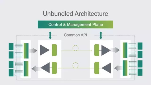 這種Open Packet DWDM系統(tǒng)是一個開放的線路系統(tǒng),允許任何設(shè)備商向系統(tǒng)貢獻(xiàn)新的軟件和硬件。在初始階段,這個開放線路系統(tǒng)里的每一個組件包含YANG數(shù)據(jù)建模語言,并為控制面軟件提供開放的北向接口。它可將來自交換機(jī)或路由器的數(shù)據(jù)信號根據(jù)相應(yīng)的信令格式重新組包傳送,支持地鐵數(shù)據(jù)中心互連和長途部署。