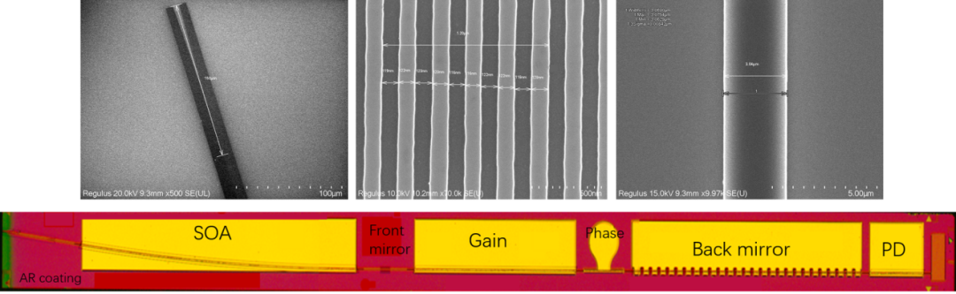調頻連續(xù)波(FMCW)激光雷達與飛行時間(ToF)激光雷達方案不同,F(xiàn)MCW方案可以實現(xiàn)速度和距離的同時測量,具有較高的空間分辨率。另外FMCW方案采用外差探測方式,可以避免環(huán)境光的影響。面向FMCW激光雷達的掃頻光源采用DBR激光器方案,和傳統(tǒng)的SG-DBR不同的是,該方案的前鏡(Front Mirror)采用均勻光柵來提高透過率,以便獲得大功率輸出;后鏡(Back Mirror)采用取樣光柵,以便獲得窄線寬性能。所研發(fā)的激光器芯片實現(xiàn)了大功率輸出(96 mW)、窄線寬(313 kHz)以及良好的單模(SMSR > 55 dB)特性。經過線性預失真后,在24 GHz的調諧帶寬內,上下半坡掃頻實現(xiàn) 0.021%和0.02%的非線性度。該激光器有望作為線性掃頻光源用在FMCW激光雷達系統(tǒng)中[3]。