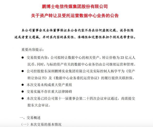 4月28日消息,鵬博士發(fā)布關于資產(chǎn)轉讓及受托運營數(shù)據(jù)中心業(yè)務的公告,擬向平盛國際金融控股有限公司、錦泉元和投資管理有限責任公司轉讓數(shù)據(jù)中心的相關資產(chǎn),轉讓價格為23億元人民幣。同時,與標的資產(chǎn)有關的數(shù)據(jù)中心業(yè)務仍由公司繼續(xù)運營和管理。