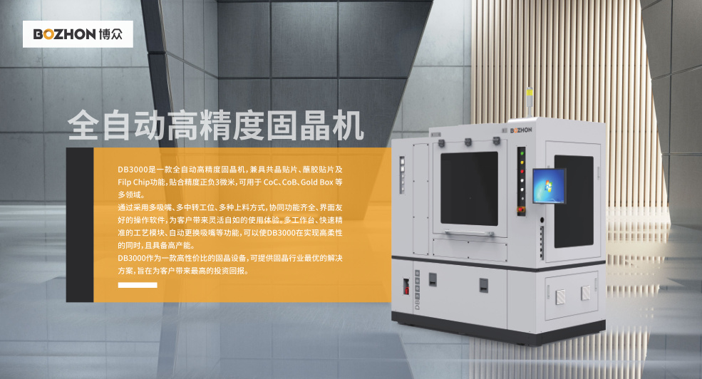 本屆盛會(huì),博眾精工科技股份有限公司(以下簡稱博眾)將攜多款半導(dǎo)體設(shè)備參展,并首次展出最新研發(fā)的全自動(dòng)高精度固晶機(jī)DB3000,該設(shè)備可廣泛應(yīng)用于光電子、微波、MEMS等領(lǐng)域。