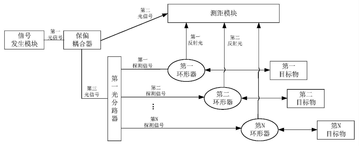 專利摘要顯示,本發(fā)明屬于光學(xué)探測(cè)技術(shù)領(lǐng)域,更具體地,涉及一種FMCW激光雷達(dá)測(cè)距裝置和測(cè)距方法,包括:信號(hào)發(fā)生模塊、保偏耦合器、第一光分路器、測(cè)距模塊以及N個(gè)環(huán)形器;所述信號(hào)發(fā)生模塊用于產(chǎn)生第一光信號(hào)并將所述第一光信號(hào)發(fā)送給所述保偏耦合器,所述保偏耦合器用于將所述第一光信號(hào)分為第二光信號(hào)和第三光信號(hào),所述第一光分路器用于將所述第三光信號(hào)分為N個(gè)探測(cè)信號(hào);每個(gè)環(huán)形器用于分別接收探測(cè)信號(hào),將所述探測(cè)信號(hào)發(fā)射至目標(biāo)物,并接收所述目標(biāo)物針對(duì)于所述探測(cè)信號(hào)的反射光;所述測(cè)距模塊用于接收所述第二光信號(hào)和N個(gè)反射光,并根據(jù)所述第二光信號(hào)和各個(gè)反射光得到相應(yīng)目標(biāo)物的距離。