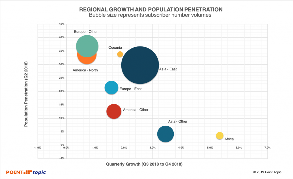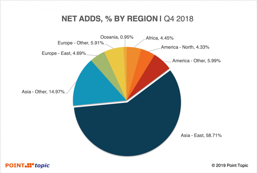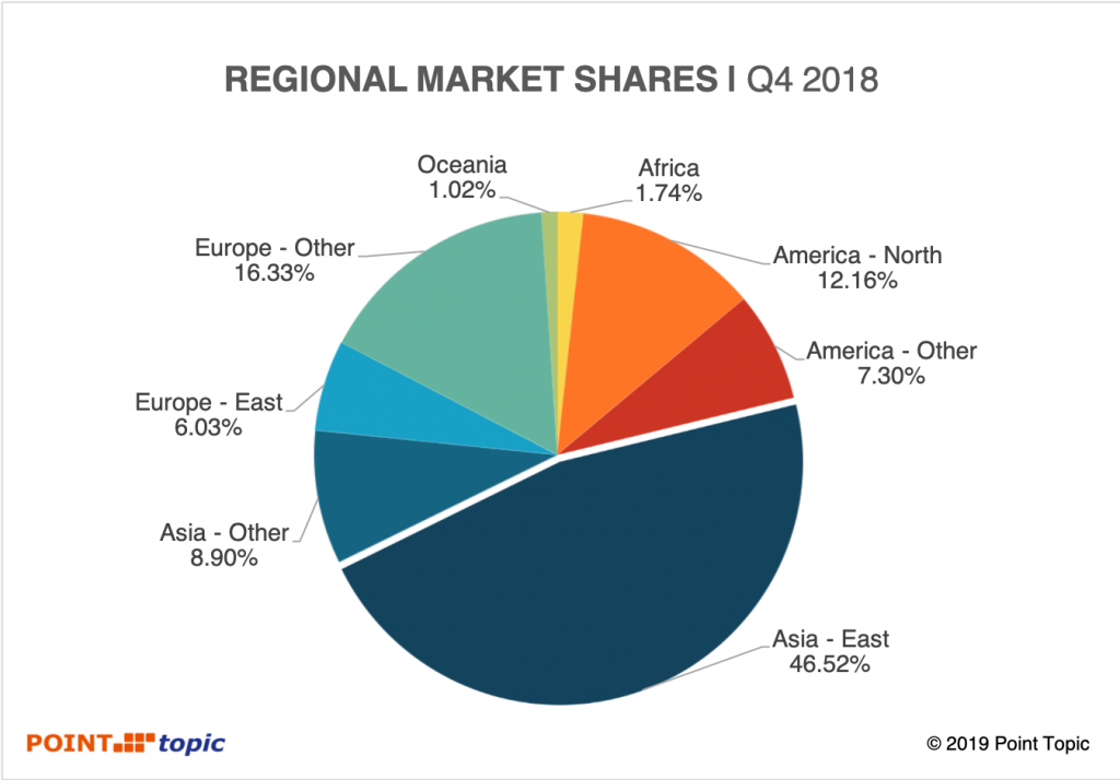 在2018年第四季度,固網(wǎng)寬帶用戶凈增量中有60%來自東亞,其中所有用戶的區(qū)域市場份額最大保持在47%。與2018年第三季度相比,除東亞地區(qū)外,各地區(qū)的市場份額變化不到一個百分點(diǎn),東亞的凈增加份額從上一季度的69%下降到58.71%。