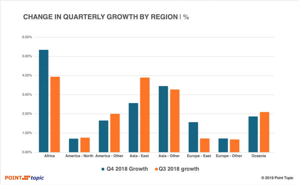 2018年第四季度,東亞的季度增長率與2018年第三季度相比下降了1.32%,為2.57%。 這是由于光纖擴(kuò)展速度減慢和xDSL服務(wù)的下降所致。