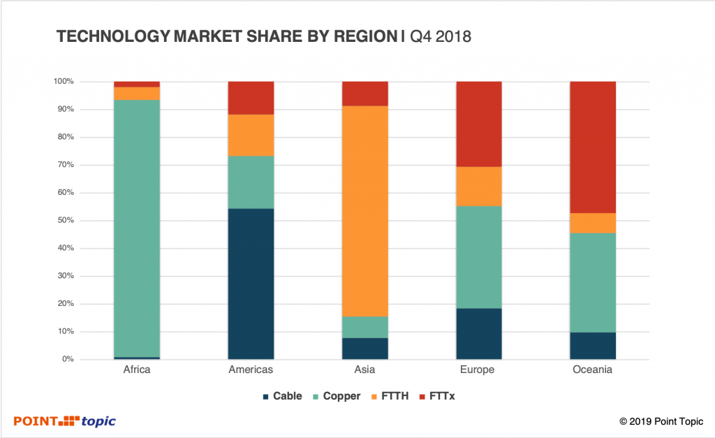 就年度變化而言,2017年第四季度至2018年第四季度全球銅線數(shù)量下降了8%,而FTTH連接數(shù)量增長了22%,F(xiàn)TTx增長了6.7%。 無論是FTTH / B還是VDSL,銅線下降的趨勢仍在繼續(xù)。