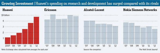 2012年,華為的研發(fā)支出增長(zhǎng)四分之一以上,達(dá)到47億美元。這樣的研發(fā)投入規(guī)模,僅次于全球最大的電信設(shè)備制造商愛(ài)立信。愛(ài)立信去年的研發(fā)投入達(dá)到了48億美元,遠(yuǎn)遠(yuǎn)領(lǐng)先于競(jìng)爭(zhēng)對(duì)手阿爾卡特-朗訊,以及諾基亞和西門子的合資公司諾基亞西門子。
