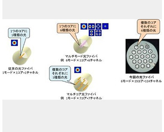 NTT和北大為了250微米以下的光纖直徑實現(xiàn)100以上的隧道多重化,使得3或6種模塊能運輸?shù)男揪€彎曲分布率適宜化,使用最適宜的芯線構造,探討芯線光纖信號干涉能充分控制的各種各樣的芯線配置進行探討。其結果是,6個模塊可以導波的核心以19個蜂窩狀排列,不足25微米的光纖直徑上,全球最大的114信道實現(xiàn)多重化。