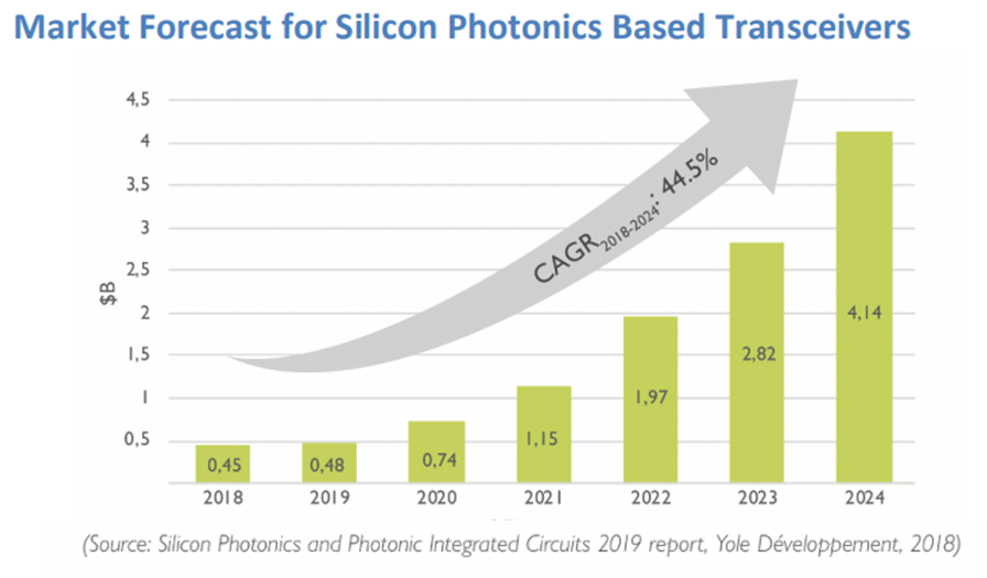 據(jù)行業(yè)預(yù)測(cè),至2024年,光模塊的市場(chǎng)總額達(dá)到160億美元,其中數(shù)據(jù)通信光模塊的營(yíng)收將達(dá)到120億美元。業(yè)界之所以對(duì)硅光倍加關(guān)注,硅光在未來(lái)數(shù)通市場(chǎng)的重要性不言而喻。