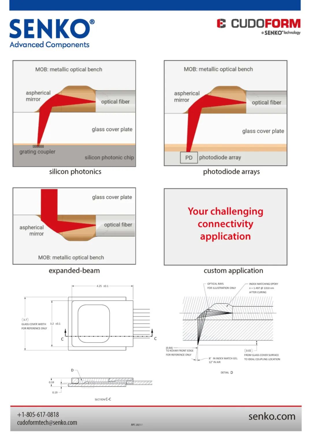 SENKO的CudoForm技術(shù)平臺利用金屬沖壓技術(shù)制造光學(xué)反射鏡,自由曲面鏡面,實現(xiàn)反射+整形(聚焦、準(zhǔn)直或擴斑),同步在鏡面外可實現(xiàn)微結(jié)構(gòu),放置光纖或其它光器件。