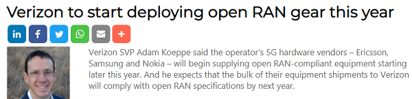 ICC訊(編譯:Nina)Light Reading消息,Verizon高級副總裁Adam Koeppe表示,該運(yùn)營商的5G硬件供應(yīng)商--愛立信、三星和諾基亞--將在今年晚些時候開始提供Open RAN兼容設(shè)備。他預(yù)計到明年,這些供應(yīng)商向Verizon供應(yīng)的大部分設(shè)備都將符合Open RAN標(biāo)準(zhǔn)。