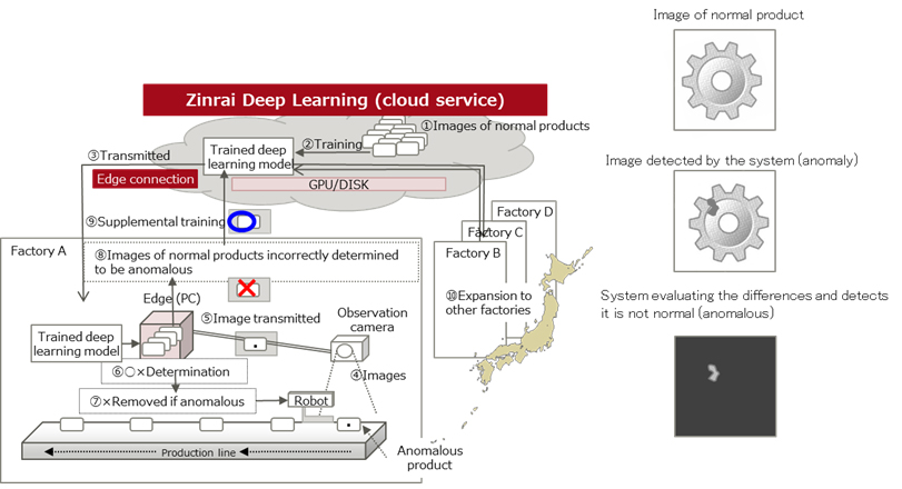客戶主要是參與制造可以使用圖像識(shí)別技術(shù)通過(guò)富士通云服務(wù)K5 Zinrai平臺(tái)服務(wù)Zinrai深度學(xué)習(xí)標(biāo)準(zhǔn)化,提高檢測(cè)的效率異常產(chǎn)品生產(chǎn)線,系統(tǒng)將訓(xùn)練圖像的正常產(chǎn)品只和自動(dòng)檢測(cè)有缺陷的產(chǎn)品。此外,通過(guò)在所有工廠采用相同的、訓(xùn)練有素的深度學(xué)習(xí)模式,可以很容易地確保異常檢測(cè)的標(biāo)準(zhǔn)是一致的,而經(jīng)過(guò)培訓(xùn)的模型可以通過(guò)對(duì)每個(gè)工廠收集的各種圖像數(shù)據(jù)進(jìn)行額外的培訓(xùn)來(lái)持續(xù)改進(jìn)。