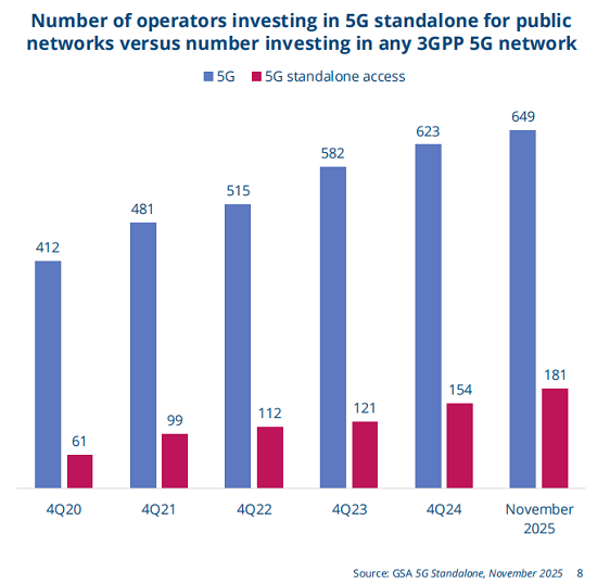 ICC訊 根據(jù)全球移動供應(yīng)商協(xié)會(GSA)于2025年12月舉辦的網(wǎng)絡(luò)研討會所發(fā)布的數(shù)據(jù),過去一年5G市場持續(xù)發(fā)展,技術(shù)從2019年的最初部署階段,已成長為數(shù)字經(jīng)濟(jì)的基石。GSA統(tǒng)計顯示,全球191個國家和地區(qū)的647家運營商正在投資5G技術(shù)。