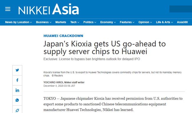 日媒評論稱,雖然最新許可還未恢復Kioxia華為的全部業(yè)務往來,但仍為Kioxia未來上市之路帶來了光明。