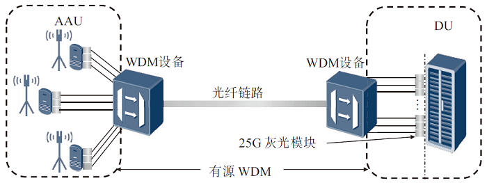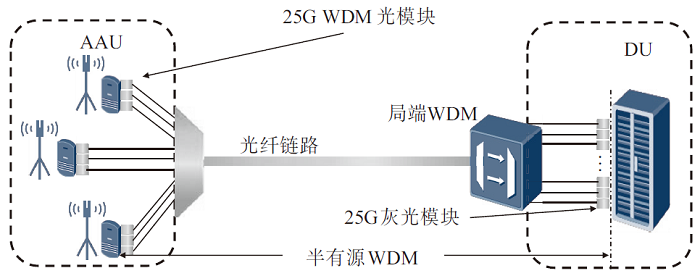 5G前傳網(wǎng)絡(luò)主要實現(xiàn)AAU到DU之間的信號拉遠傳輸。集中式的CRAN架構(gòu)給5G前傳網(wǎng)絡(luò)提出了新的需求,波分復(fù)用成為前傳網(wǎng)絡(luò)的優(yōu)選方案,并存在無源WDM、有源WDM、半有源WDM等多種WDM網(wǎng)絡(luò)架構(gòu)。