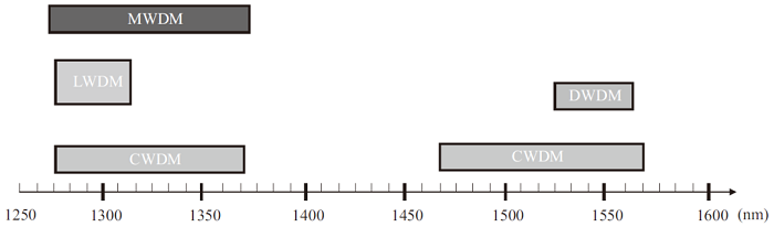 應(yīng)用于5G前傳的N×25 Gbit/s WDM技術(shù)根據(jù)使用的波長不同,目前有粗波分復(fù)用(CWDM)、基于以太網(wǎng)通道的波分復(fù)用( LWDM)、中等波分復(fù)用(MWDM)和密集波分復(fù)用(DWDM)4種,波長如圖4所示。