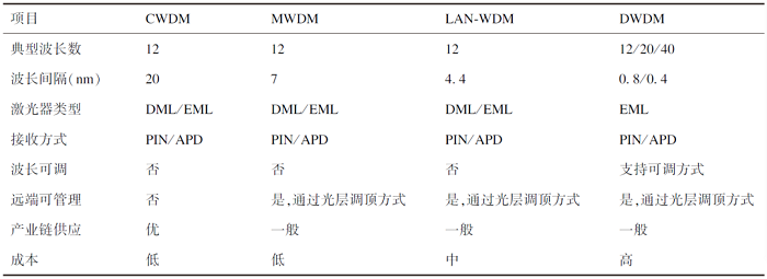 CWDM系統(tǒng)使用ITU-T G.694.2規(guī)范的1271 nm~1491 nm波長范圍,通道間隔20 nm。LWDM以IEEE 802.3-2018規(guī)范的400 GE LR8波長范圍(1273.54 nm~1309.14 nm)為基礎(chǔ),通道間隔800 GHz(約4.4 nm),對于12波系統(tǒng),需進行4個波長的擴展,目前初定波長范圍在1269.3 nm~1318.35 nm。MWDM方案使用的波長范圍為1265 nm~1377 nm,對CWDM的6個標(biāo)準(zhǔn)CWDM波長進行通路間隔壓縮后擴展得到12個波長。DWDM主要是基于ITU-T G.698.x標(biāo)準(zhǔn),使用C波段(1529.55 nm~1565.50 nm)。不同WDM技術(shù)的關(guān)鍵特性和實現(xiàn)方式比較見表1。